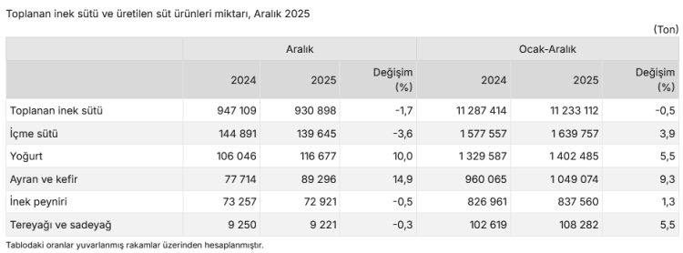 TÜİK verilerine göre Aralık 2025'te ticari süt işletmeleri 930 bin 898 ton inek sütü topladı. Toplanan süt miktarı yıllık bazda yüzde 1,7 azalırken, ayran-kefir ve yoğurt üretiminde dikkat çeken artış kaydedildi.