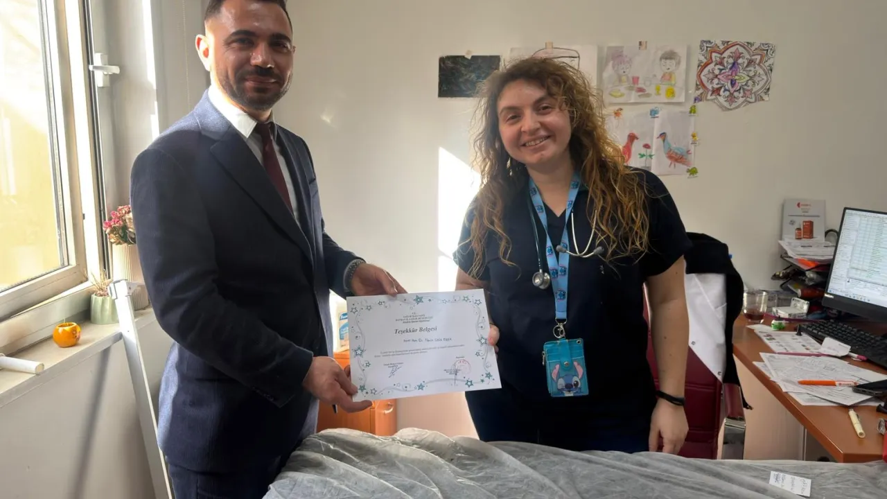 Hastaların ilettiği olumlu geri bildirimler ve genel hasta memnuniyet oranlarının yüksekliği üzerine, Hastane Başhekimi Dr. Fırat Güneş tarafından Uz. Dr. Nevin Çelik Fişek'e teşekkür belgesi takdim edildi.