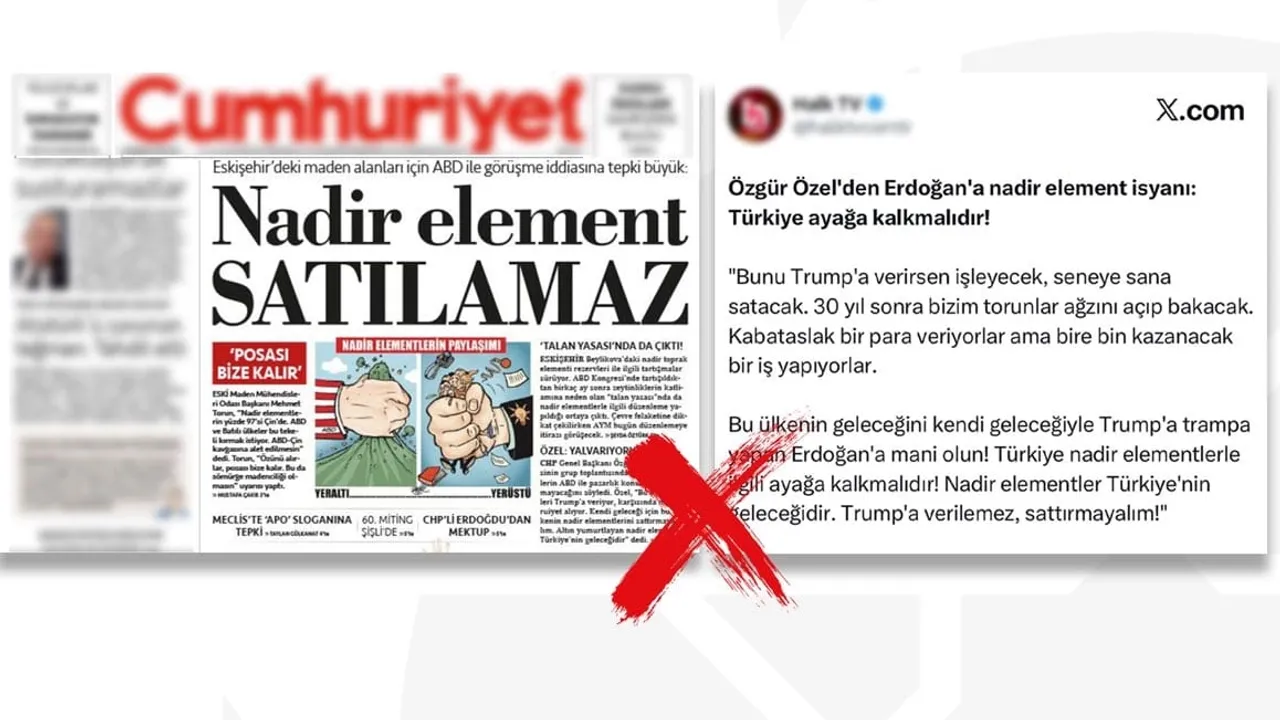 Eskişehir'deki Nadir Toprak Elementleri sahasının ABD'ye devredileceği yönündeki iddialar gerçeği yansıtmıyor. Cumhurbaşkanlığı İletişim Başkanlığı, 'manipülatif ve yönlendirme amaçlı' bu paylaşımlara itibar edilmemesi uyarısında bulundu.