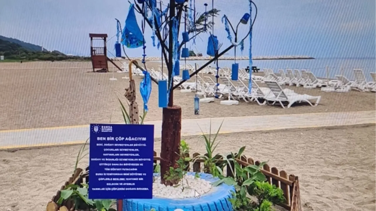 Karacabey Kurşunlu Halk Plajı’ndaki temizlik çalışmasında toplanan çöp ve atıklar, vatandaşlar tarafından boyanarak geri dönüşüm temalı çöp ağacına dönüştürüldü.