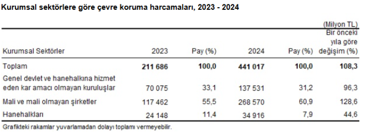 Bir önceki yıla göre yüzde 114,2 artarak toplam 82 milyar TL olarak gerçekleşen çevre koruma yatırım harcamalarının yüzde 80'i mali ve mali olmayan şirketler, yüzde 20'si ise genel devlet ve hanehalkına hizmet eden kar amacı olmayan kuruluşlar tarafından yapıldı.