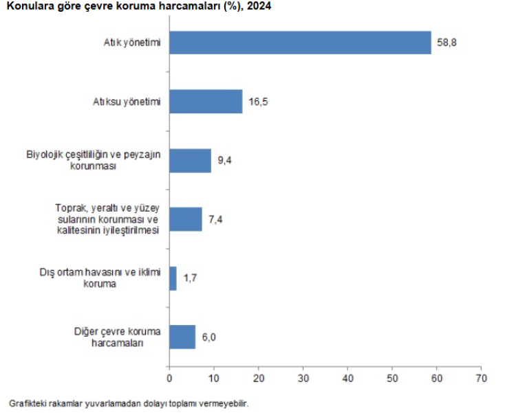 Çevre koruma harcamalarının yüzde 58,8'i atık yönetimi hizmetlerinden, yüzde 16,5'i atıksu yönetimi hizmetlerinden, yüzde 9,4'ü biyolojik çeşitliliğin ve peyzajın korunmasından, yüzde 7,4'ü toprak, yeraltı ve yüzey sularının korunması ve kalitesinin iyileştirilmesinden, yüzde 1,7'si dış ortam havasını ve iklimi korumadan ve yüzde 6'sı ise diğer çevre koruma konularından oluştu.