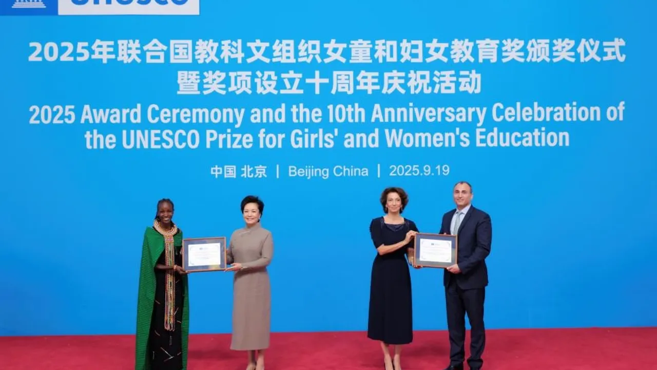 Çin Devlet Başkanı Xi Jinping'in eşi ve UNESCO'nun kız çocukları ve kadınların eğitiminin ilerletilmesi özel temsilcisi Peng Liyuan ile UNESCO Genel Direktörü Audrey Azoulay bu iki programa verilen ödülleri takdim etti.