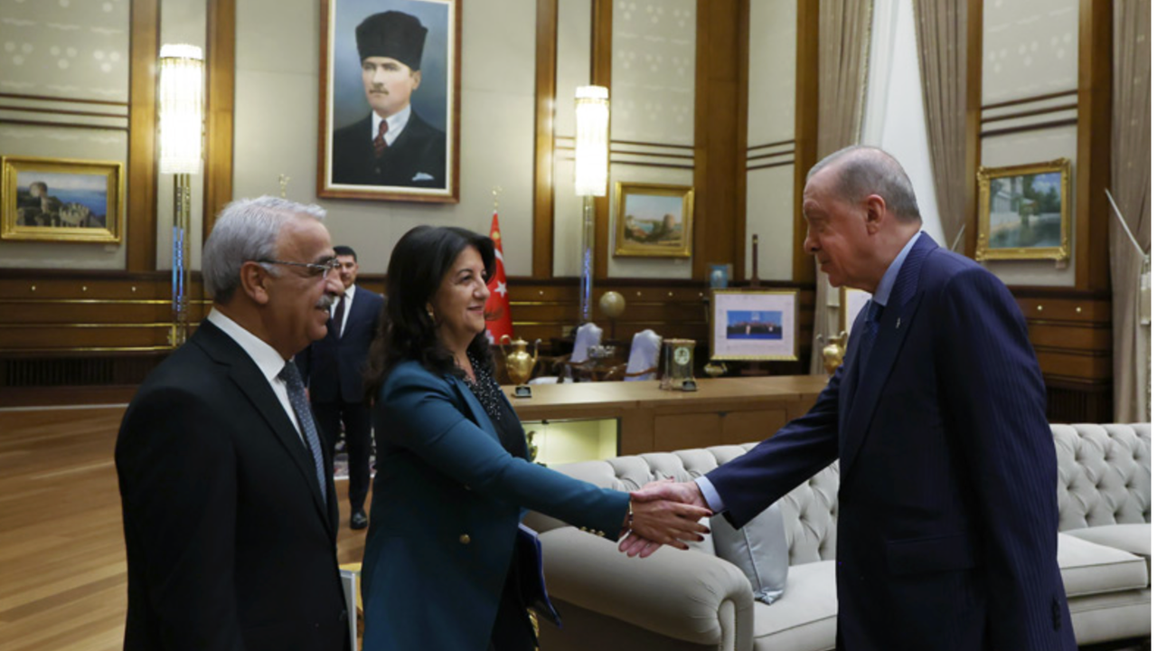 Terörsüz Türkiye için PKK'nın silah bırakmasına ilişkin görüşmeler devam ediyor. Cumhurbaşkanı Recep Tayyip Erdoğan, DEM Parti heyetinde yer alan TBMM Başkanvekili ve Van Milletvekili Pervin Buldan ile Şanlıurfa Milletvekili Mithat Sancar'ı Cumhurbaşkanlığı Külliyesinde kabul etti. Cumhurbaşkanı Erdoğan'ın Beştepe'de DEM Parti İmralı Heyetini kabulü yaklaşık 1 saat sürdü.