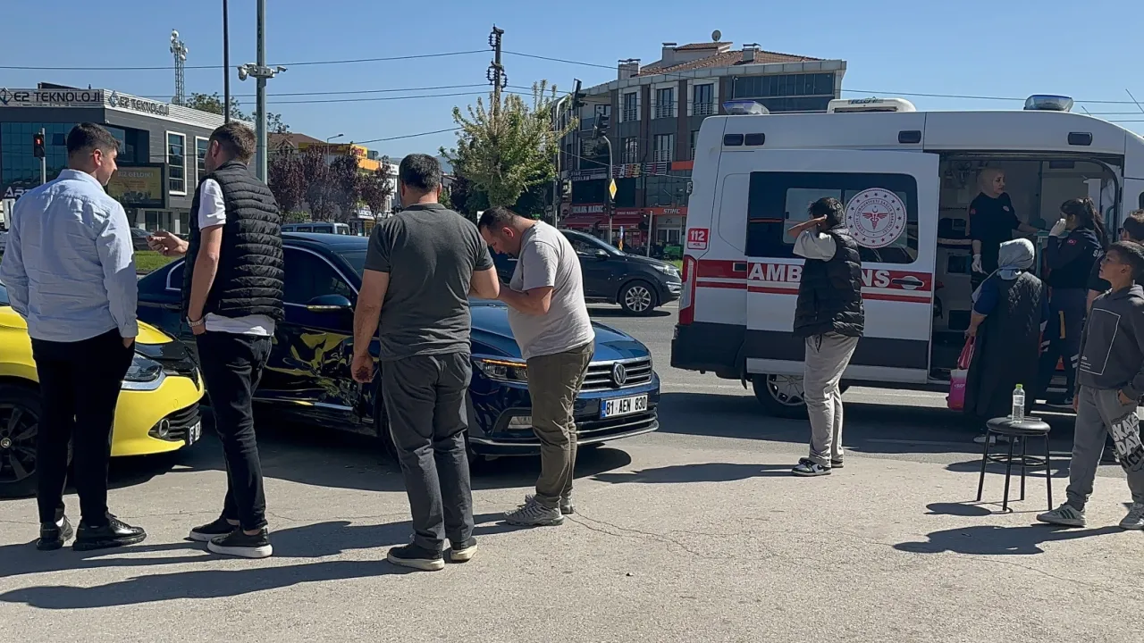 Düzce’de Öztürkler ışıklı kavşağında iki otomobilin çarpışması sonucu bir kadın hafif yaralandı.Sefer DEMİR / DÜZCE (İGFA) - Düzce'de Öztürkler ışıklı kavşağı İstanbul istikametinde 81 AEN 830 plakalı otomobile akaryakıt istasyonundan kontrolsüz çıkan 67 EP 059 plakalı otomobil çarptı.