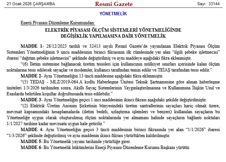 Yönetmelikte ayrıca, TEDAŞ - MLZ/2019-064.A kodlu Haberleşme Ünitesi Teknik Şartnamesi kapsamında alınan haberleşme ünitelerinin, 1 Mart 2026 tarihinden sonra yalnızca Akıllı Sayaç Sistemlerine ilişkin usul ve esaslarda belirtilen koşullara uygun olarak tesis edilebileceği belirtildi. Geçici maddelerde yapılan değişiklikle, Elektrik Üretim AŞ'ye ait santrallerin sayaçları hariç olmak üzere, mevzuat kapsamında kullanılan sayaçların bağlantı noktalarının 1 Ocak 2027'ye kadar yönetmeliğe uygun hale getirilmesi zorunlu kılındı. Ayrıca bazı geçiş hükümlerinin yürürlük tarihleri güncellendi.