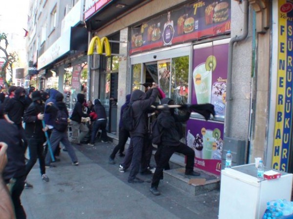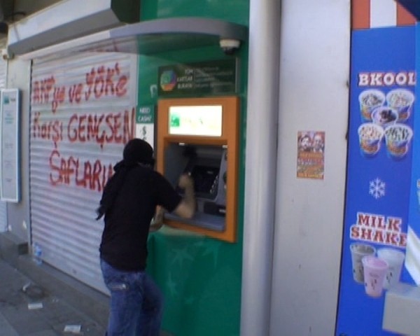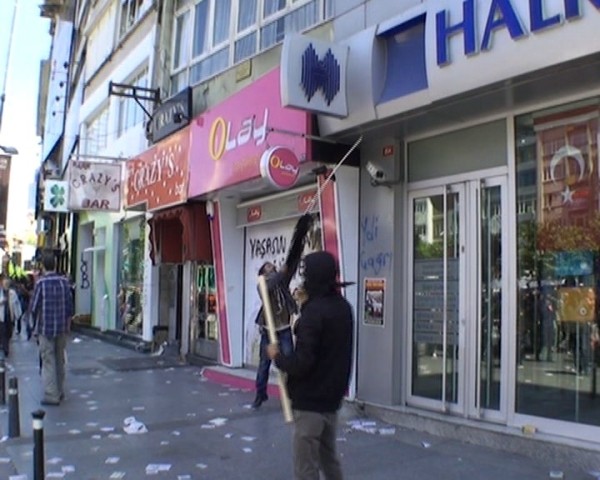 Taksim Meydanı’na yürüyen ve kendilerine ‘Anarşist’ adını veren bir grup, çevredeki iş yerlerinin camlarını kırdı, bir otelin güvenlik kameralarını parçaladı.