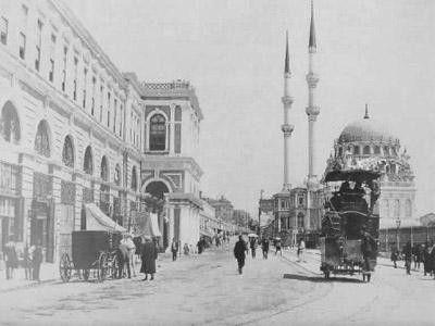100 yıl önce Taksim: Meydan olmadan önce, eski evlerin sıralandığı dar bir bölge olan semt, meydan haline getirilip genişletildikten sonra zamanla bugünkü görünümünü almıştır. Not: Bu fotoğraf yakın tarihe aittir.