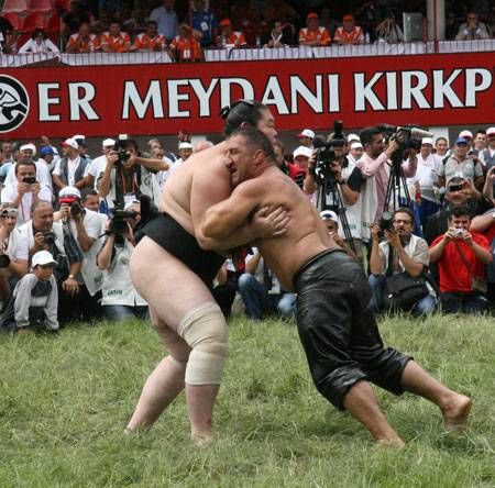 TÜRKİYE'NİN VE JAPONLARIN YÜZLERCE YILLIK GEÇMİŞE SAHİP ATA SPORLARI, KIRKPINAR YAĞLI GÜREŞLERİ VE SUMO GÜREŞİ, EDİRNE'DE BULUŞTU. SARAYİÇİ ER MEYDANI'NDA KIRKPINAR'IN EFSANE İSMİ 2 ALTIN KEMERLİ AHMET TAŞÇI İLE JAPON SUMOCU AKUNA MİNA GÜREŞTİ.
