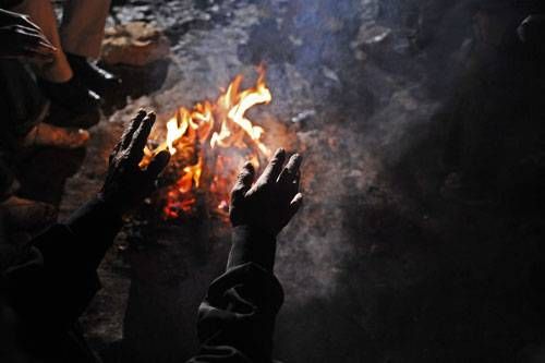 ELAZIĞ DEPREMİNDE SOĞUK HAVADA GECEYİ DIŞARIDA GEÇİRMEK ZORUNDA KALAN BİR YAŞLI ADAM, KÖY MEYDANINDA YAKILAN ATEŞİN ÖNÜNDE ISINMAYA ÇALIŞIYOR.