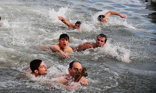 HIRİSTİYAN İNANCINA GÖRE HZ. İSA'NIN DOĞUMU VE VAFTİZ EDİLİŞİNİN 2010. YIL DÖNÜMÜ, FENER RUM PATRİKHANESİ'NDE DÜZENLENEN AYİN VE DENİZDEN HAÇ ÇIKARMA TÖRENİYLE KUTLANDI. HIRİSTİYAN GENÇLER, SOĞUK HAVAYA RAĞMEN DENİZE ATLAYARAK TAHTA HAÇI ÇIKARMAK İÇİN BİRBİRLERİYLE YARIŞTI.