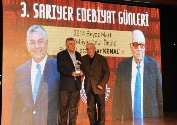 SARIYER Sarıyer Belediyesi tarafından bu yıl üçüncüsü düzenlenen Sarıyer Edebiyat Günleri’ne Yaşar Kemal Onur Ödülü damgasını vurdu. Rahatsızlığı nedeniyle adına düzenlenen ödül törenine katılamayan Yaşar Kemal’e verilen "Beyaz Martı Onur Ödülü"nü eski arkadaşı, dostu Osman Arolat, Sarıyer Belediye Başkanı Şükrü Genç'in elinden teslim aldı.