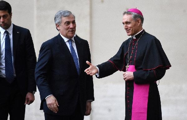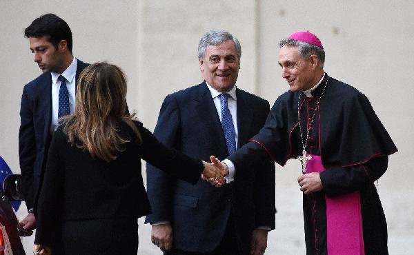 Papa Francesco'nun, Roma Antlasmasi'nin 60'inci yili munasebetiyle Roma'ya gelen AB liderlerini Vatikan'daki kabulune, Avrupa Parlamentosu Baskani Antonio Tajani de katildi. FOTOGRAF: ESMA CAKIR - ROMA / DHA