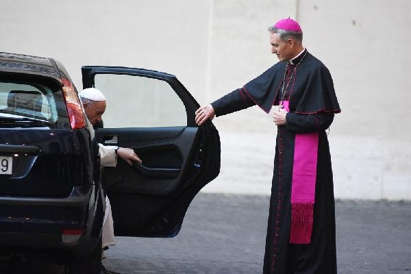 Papa Francesco, Roma Antlasmasi'nin 60'inci yili munasebetiyle Roma'ya gelen AB liderlerini Vatikan'da kabul etti. Papa, kabulun gerceklestigi Apostolik Saray'a gelirken.