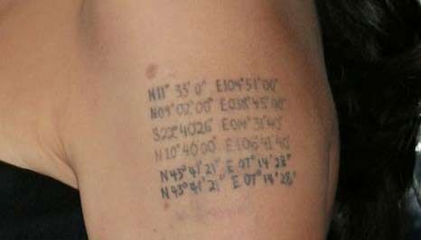 Birinci dövme,Madox isimli en büyük çocuğunun doğduğu Kamboçya,ikincisi iki yaşındaki Zahara’nın memleketi Etiyopya,üçüncüsü Shilon isimli öz kızının doğduğu Namibya,dördüncü evlat edindiği Pax Thien’in memleketi Vietnam’ı, son iki dövme ise ikizlerinin doğduğu Fransa'nın koordinatlarını gösteriyor.
