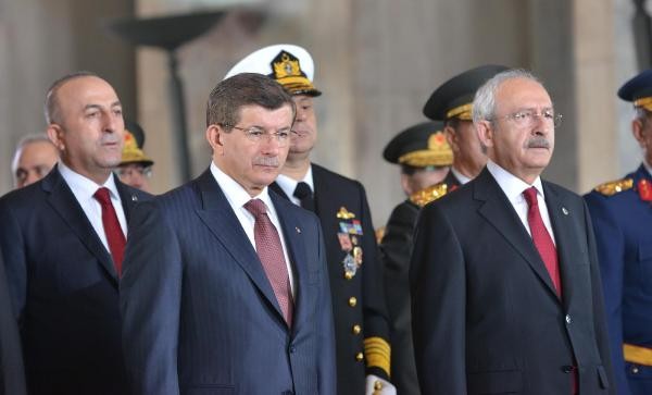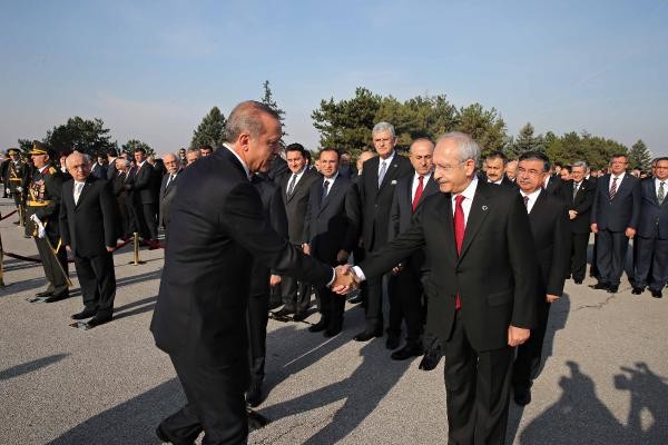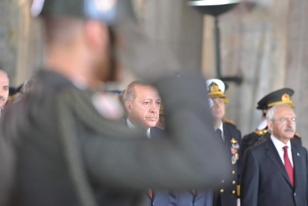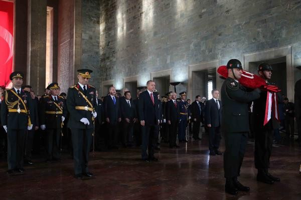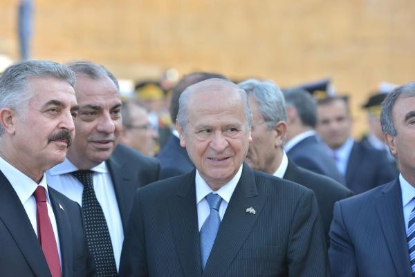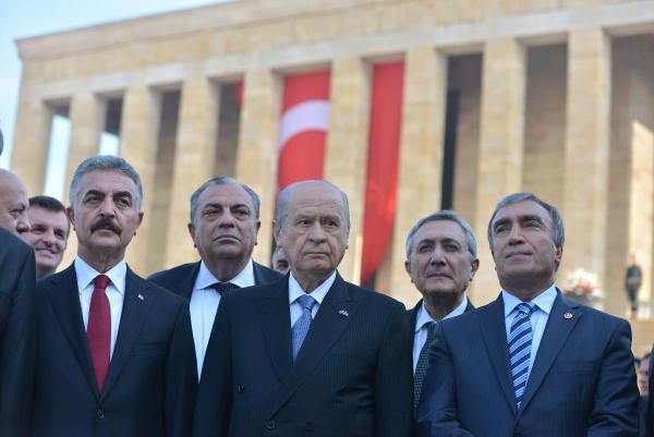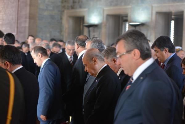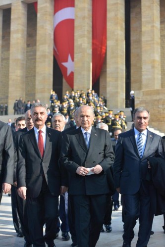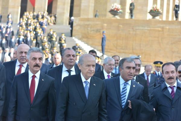 MHP Genel Başkanı Devlet Bahçeli ise ön sırada yürümek yerine, arkalarda partililerle birlikte Aslanlı yoldan yürüyerek mozolenin bulunduğu yere geldi. Burada da Davutoğlu arka sıralarda durmayı tercih ederken, Cumhurbaşkanı Erdoğan Atatürk'ün mozolesine çelenk koydu.
