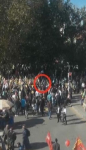 Görüntülerde, ayrıca ilk bombacının kalabalık arasına girdiği, bir süre bekledikten sonra patlama olduğu, bu sırada insanların sağa sola kaçışmasının ardından ikinci canlı bombanın kendini patlattığı görülüyor.