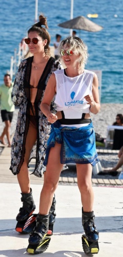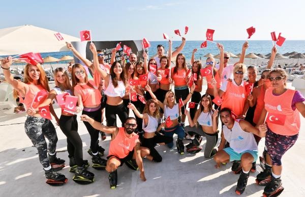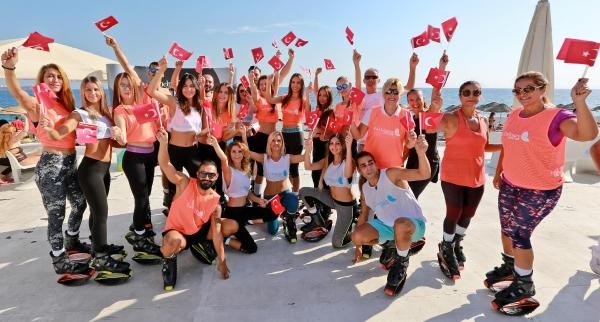 İşletmenin spor hocaları Uğur Can Poyraz, Tuğberk Sönmezer, Nazlı Odabaşı ve Anıl Şengül'de kangoo jumps ekibinin içinde ter döktü. Ellerinde Türk bayrakları ile zıplayan kadınlı erkekli gruba sahilde güneşlenen tatilciler de eşlik etti.