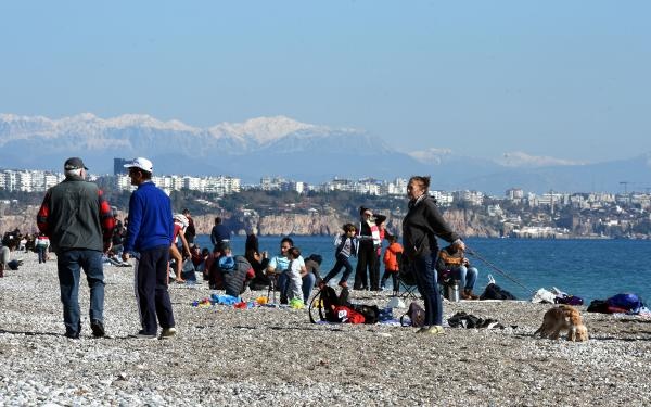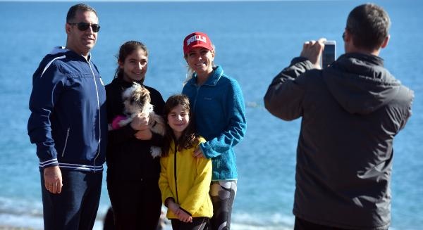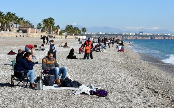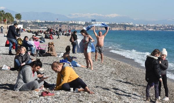 Antalya'da yaşayanlar ve tatilciler yeni yılın ilk sabahına güneşli havayla 'merhaba' dedi. Hava ve deniz suyu sıcaklığının 18 derece ölçüldüğü kentte güneşli havayı fırsat bilenler Konyaaltı sahiline akın etti.