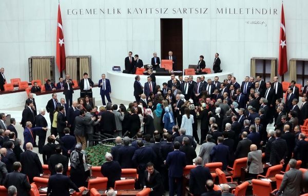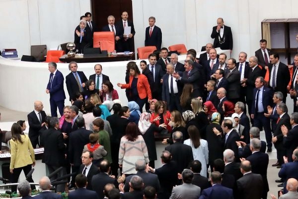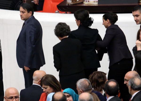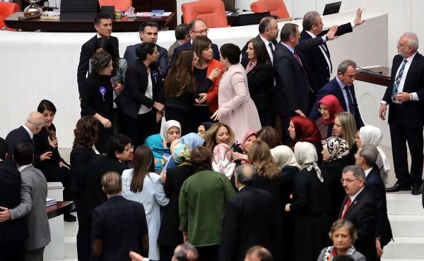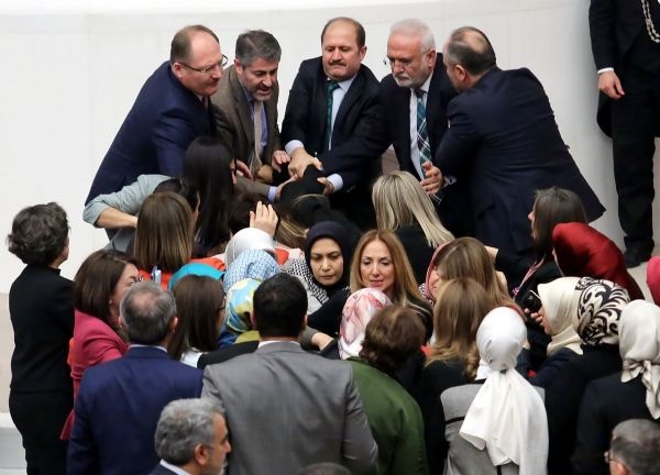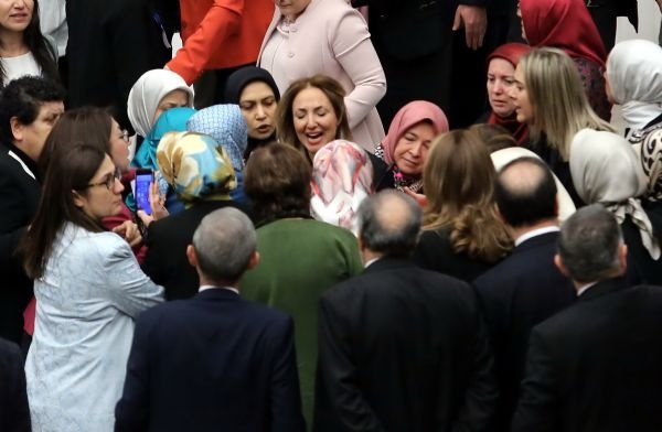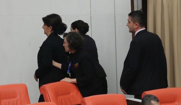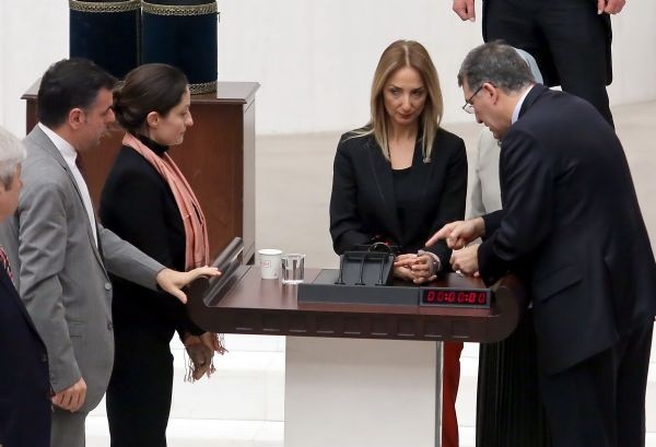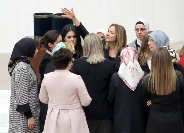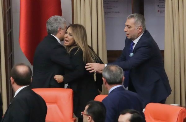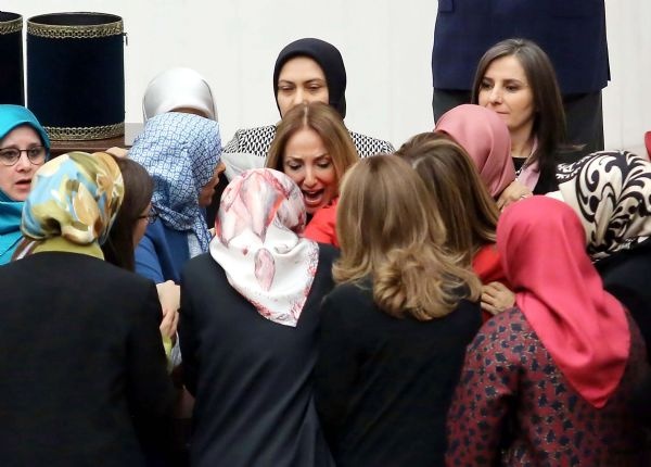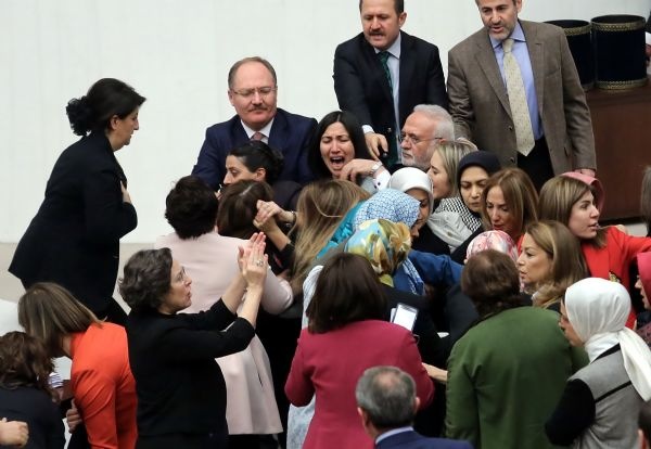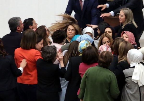Ak Partili ve HDP'li kadın milletvekilleri, TBMM Genel Kurulunda konuşma yapılan kürsüye kendisini kelepçeleyen bağımsız milletvekili Aylin Nazlıaka'nın etrafını sardı.