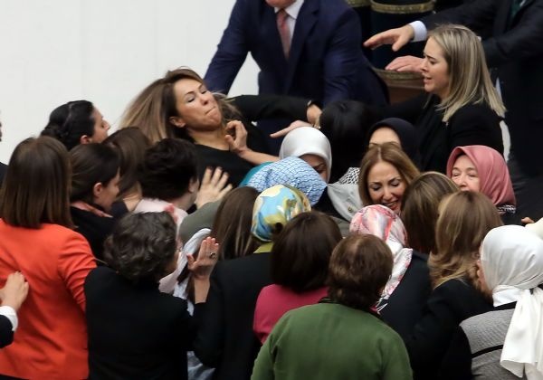 Ak Partili kadın milletvekilleri Nazlıaka’nın kelepçesini açmak isteyince, kavga çıktı. Ak Parti ve HDP’li kadın milletvekilleri saç saça, baş başa kavga etti.