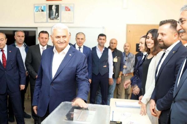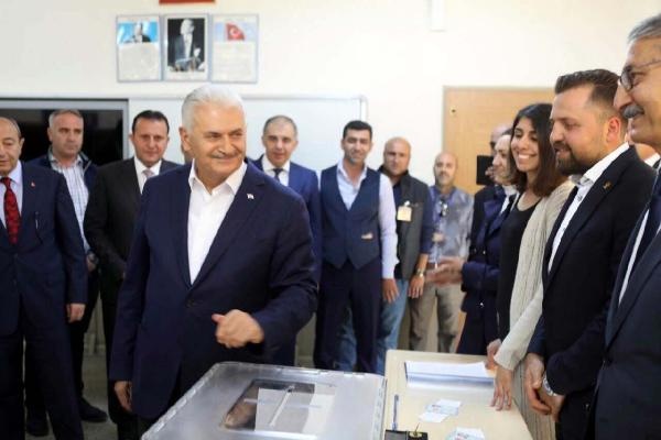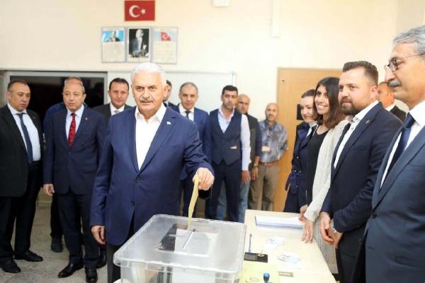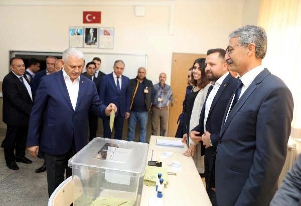 Başbakan Yıldırım, oyunu sandığa attıktan sonra sıra bekleyen bazı seçmenlerle fotoğraf çektirdi. Bahçeye çıktığında Yıldırım'a Ak Partililer 'Türkiye seninle gurur duyuyor' tezahüratı yaptı. Yıldırım, binanın merdiveninde konuşma yapmasını isteyen partililere "Burası balkon değil" diye espri yaptıktan sonra, bahçede kurulan kürsüde hitap etti.
