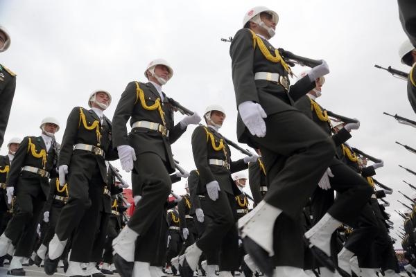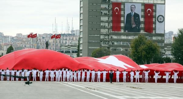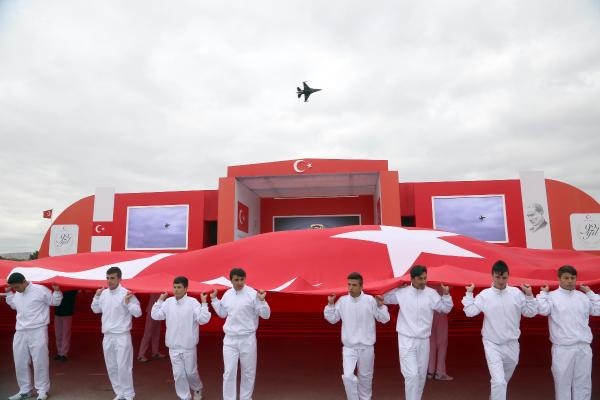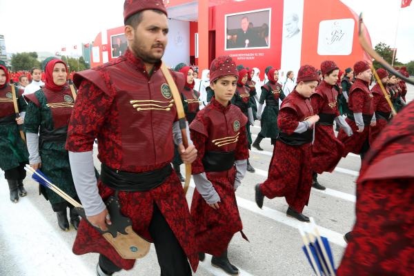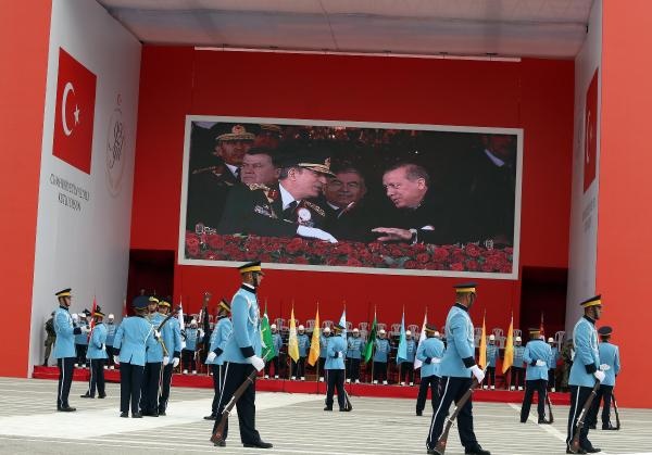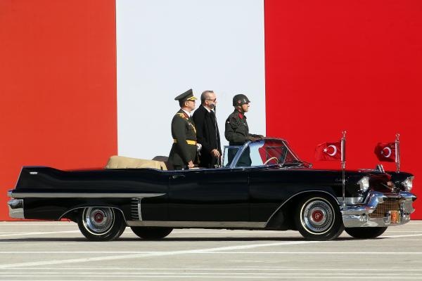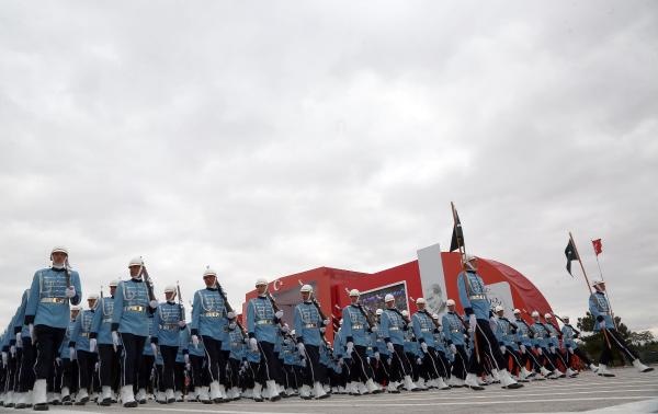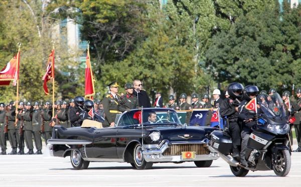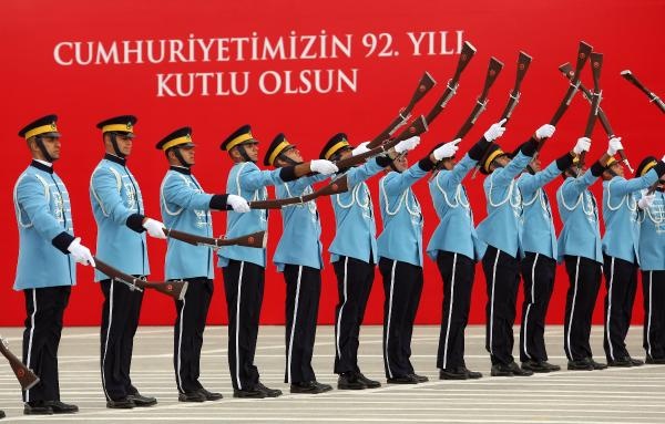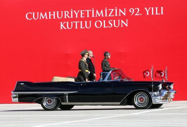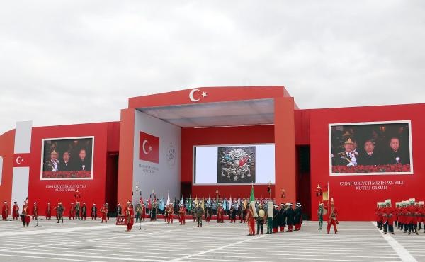 Cumhurbaşkanı Erdoğan, yanında Genelkurmay Başkanı Orgeneral Akar olduğu halde, tören alanını klasik otomobil üzerinden selamladı. Selamlamanın ardından kırmızıya boyanan ve üzerinde 92. yıl logosu bulunan Ankara Büyükşehir Belediyesi'ne ait 4 çöp kamyonunun alanı temizlemesi dikkati çekti.