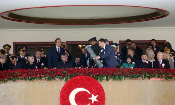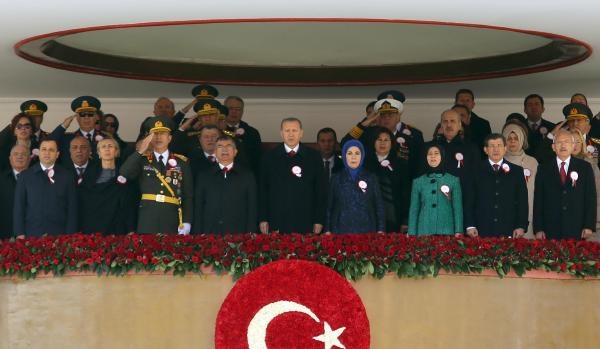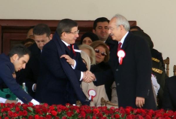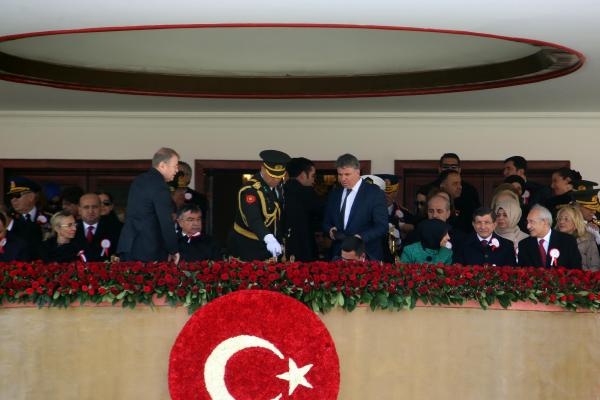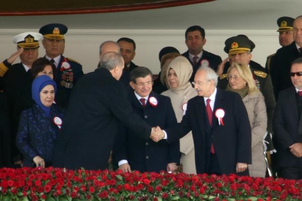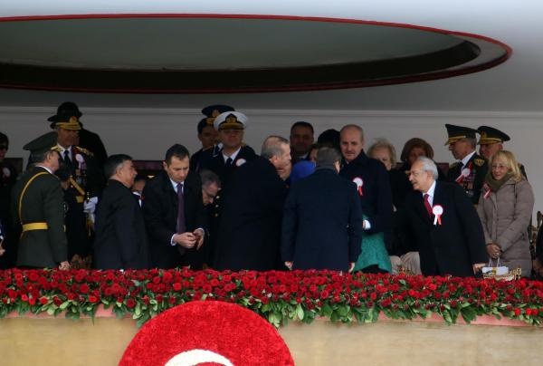 Cumhurbaşkanı Erdoğan'ın da oturacağı protokolün bulunduğu ön sıralara hava sıcaklığının soğuk olması nedeniyle 3 adet ısıtıcı konuldu. Bu sırada Kılıçdaroğlu'nun Davutoğlu çiftiyle samimi ve keyifli sohbeti dikkatlerden kaçmadı. Cumhurbaşkanı Erdoğan'ın Kılıçdaroğlu'nun da olduğu protokolle tokalaşmasının ardından kutlama töreni İstiklal Marşı'nın okunmasının ardından başladı.