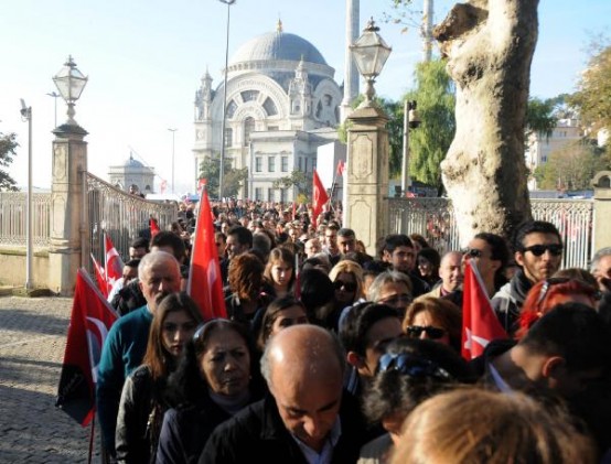 Dolmabahçe Sarayı girişinde bulunan kalabalık sık sık “Mustafa Kemal’in askerleriyiz”, “Her yer Taksim her yer direniş”, “Bu daha başlangıç mücadeleye devam”, “Türkiye laiktir laik kalacak” şeklinde sloganlar attı. Dolmabahçe’de bulunan çay bahçesinde toplanan Türkiye Gençlik Birliği (TGB) üyesi bir grup ise anmadan sonra İstiklal Marşı ve Andımız’ı okudu.