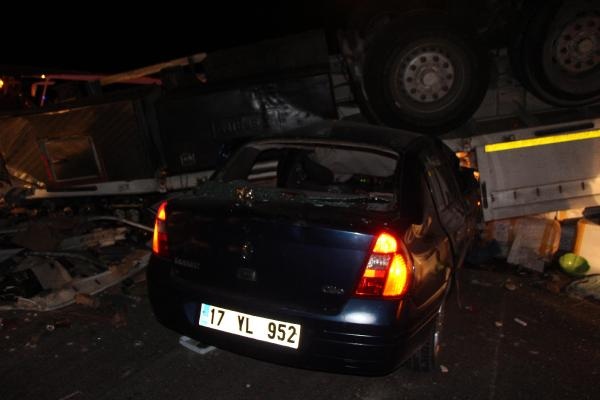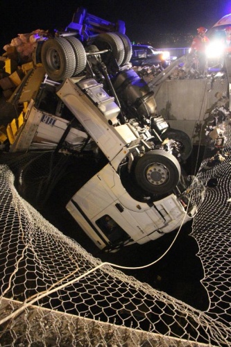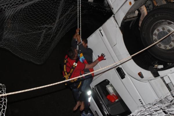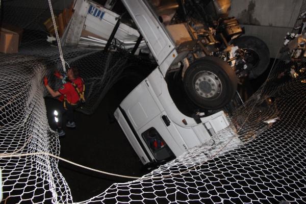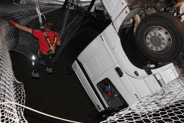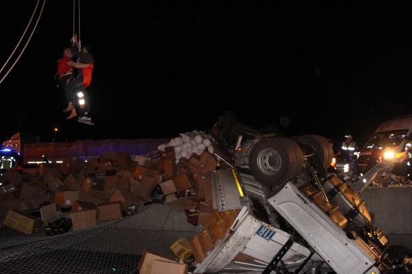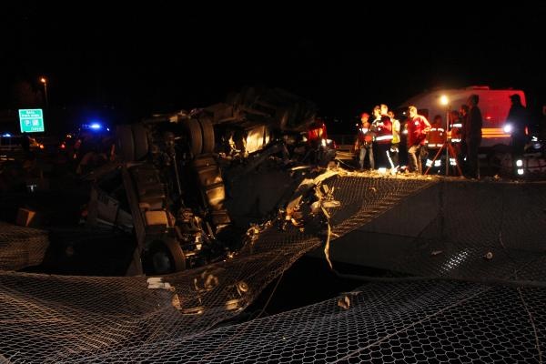 BOLU'da TEM yolunda kontroden çıkan ve çekici kısmı bariyerleri aşarak köprüde asılı kalan TIR'ın dorsesine arkadan otomobil çarptı. Kazada 1 kişi öldü, 4 kişi yaralandı. 40 metre yükseklikteki köprüde asılı kalan çekicideki sürücü, halatla yukarıya çekilerek kurtarıldı.