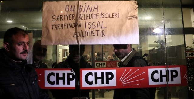 SARIYER Belediyesi'nde çalışan taşeron işçiler, tazminatları verilmeden atıldıkları gerekçesiyle CHP İstanbul İl Başkanlığı binasını işgal etti. İki gün önce işlerine döneceklerine ve tazminat haklarını alacaklarına dair imzalanan tutanağa rağmen verilen sözün yerine getirilmediğini öne süren işçiler, binanın giriş kapısını zincirle kilitledi. CHP İstanbul İl Başkanı Murat Karayalçın'ın da içeride olduğu öğrenildi.