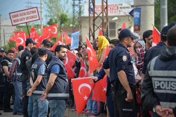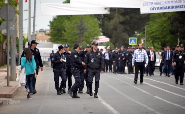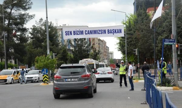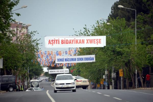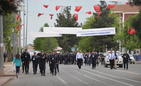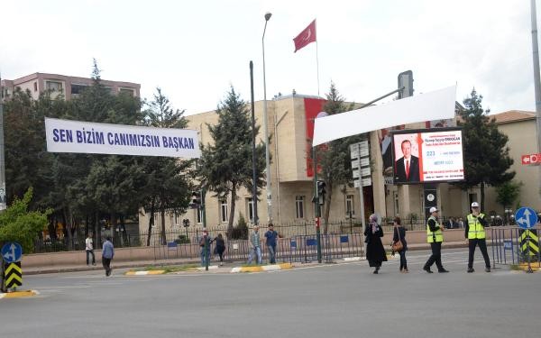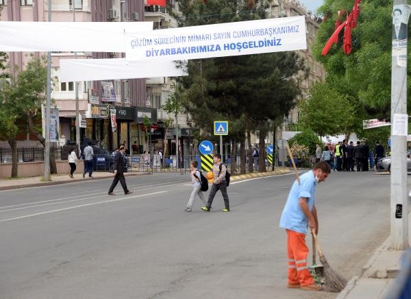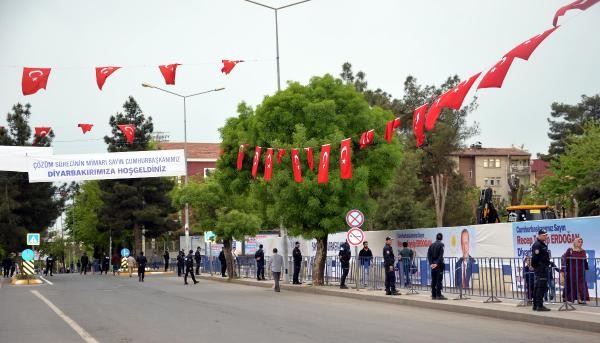 Cumhurbaşkanı Erdoğan'ın ziyareti nedeniyle Diyarbakır'da sıkı güvenlik önlemleri alındı. Kentin sokaklarına Erdoğan'ıng elişiyle ilgili Türkçe ve Kürtçe pankartlar asıldı.