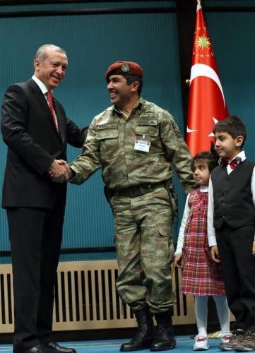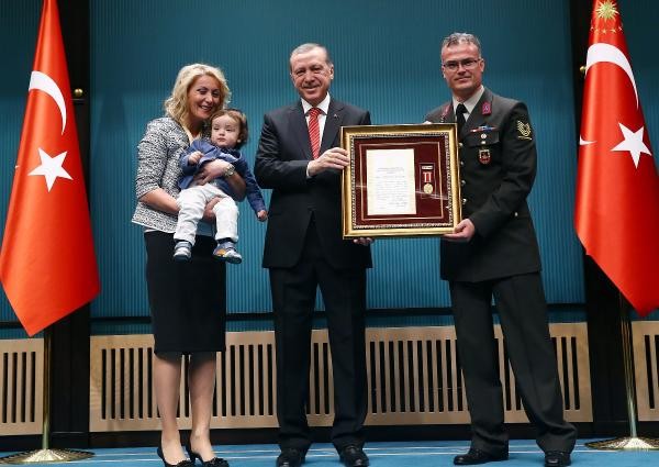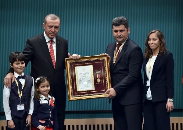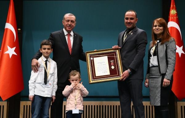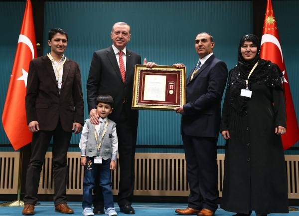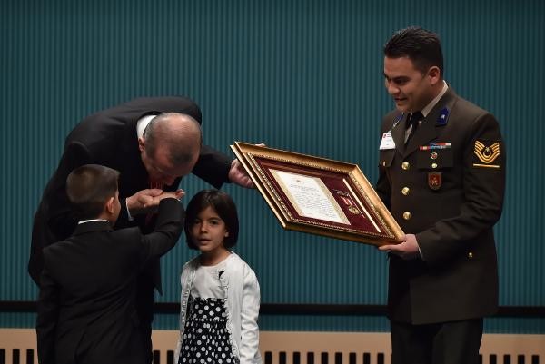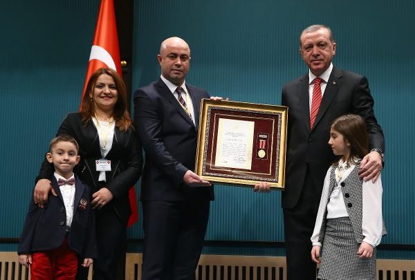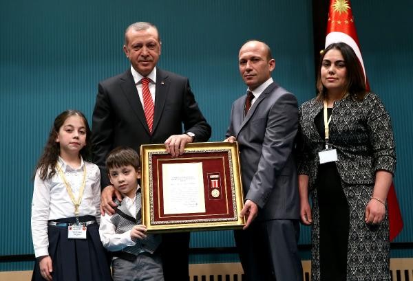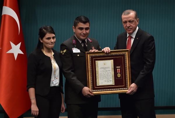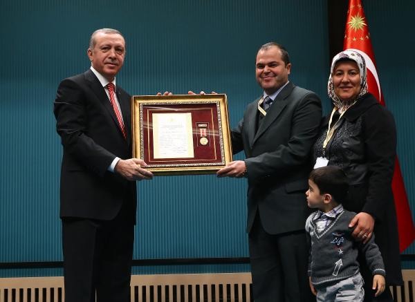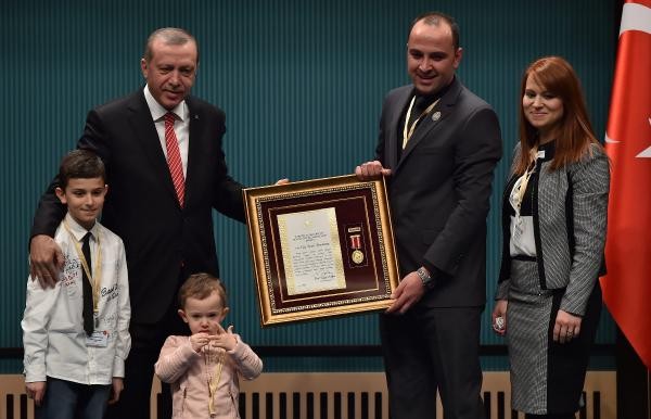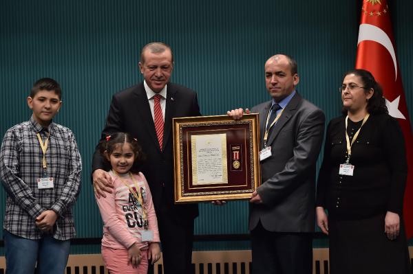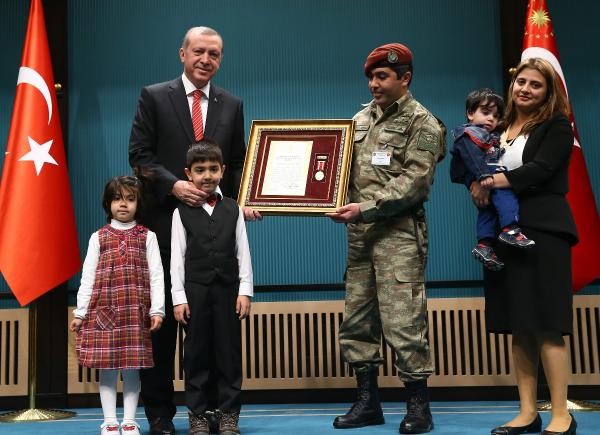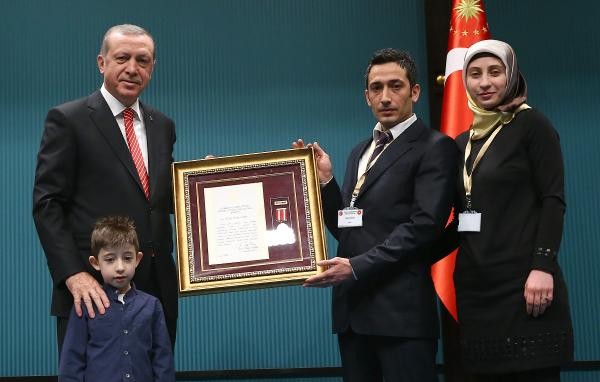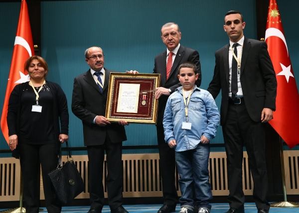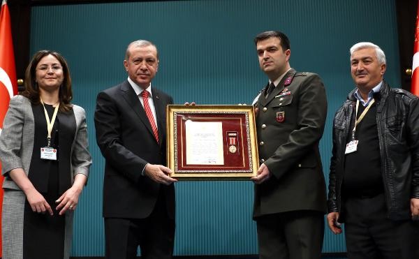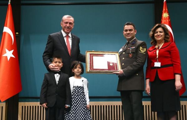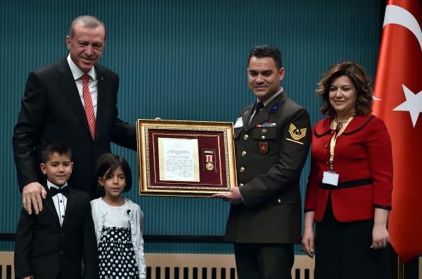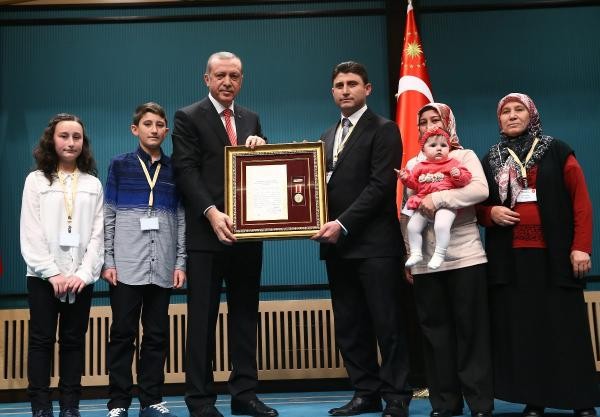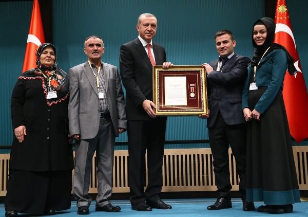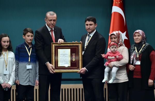 Cumhurbaşkanı Recep Tayyip Erdoğan, Devlet Övünç Madalyası ve Beratı Tevcihi törenine katılarak madalya ve beratları sahiplerine verdi. Cumhurbaşkanlığı Sarayı’nda gerçekleştirilen törende yaptığı konuşmasına, "Değerli kardeşlerim, değerli şehit aileleri, değerli gazilerimiz, sizleri en kalbi duygularımla selamlıyorum" şeklinde başlayan Cumhurbaşkanı Erdoğan, "Bugün, Devlet Övünç Madalyası ve Beratı alacak tüm asker ve polis kardeşlerimize, onların ailelerine, ülkemize yaptıkları hizmetler için şükranlarımızı sunuyorum. Şehitlerimizi rahmetle, minnetle, hürmetle yâd ediyor, Allah onlardan razı olsun diyorum. Gazilerimize, mücadeleleri, fedakârlıkları sebebiyle samimi şükranlarımı sunuyorum"dedi.