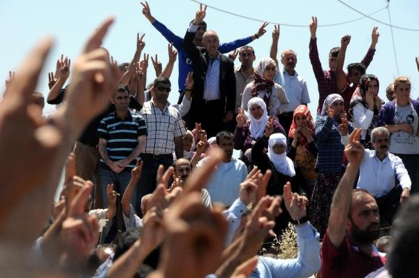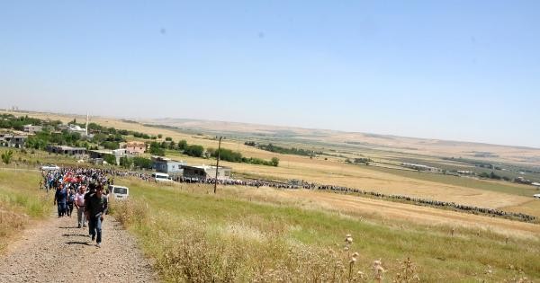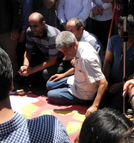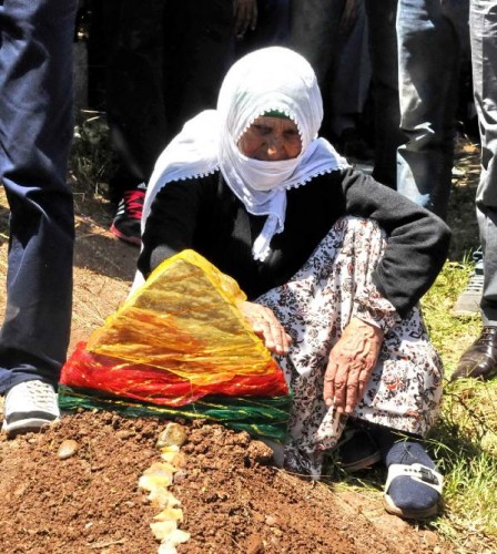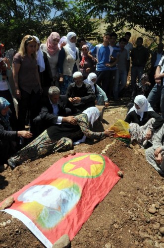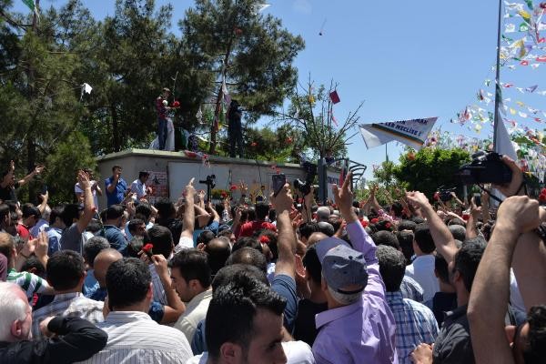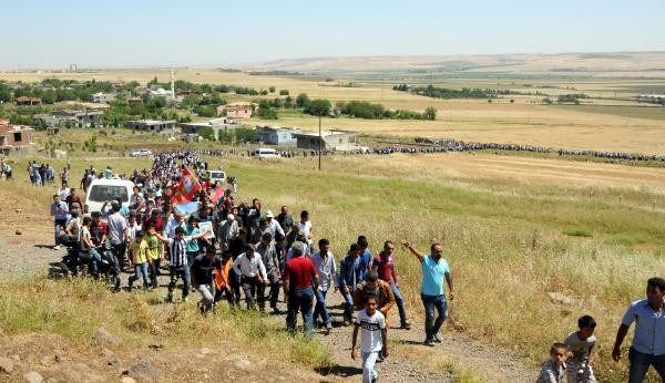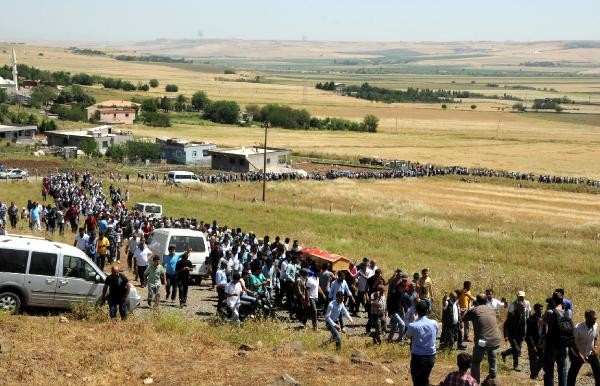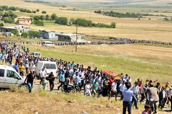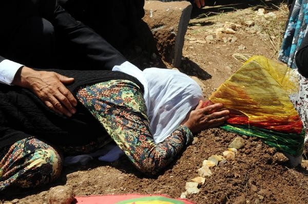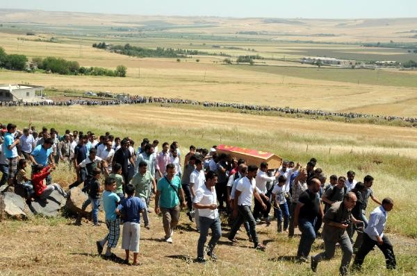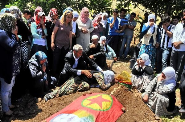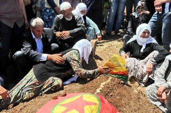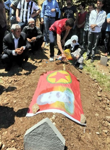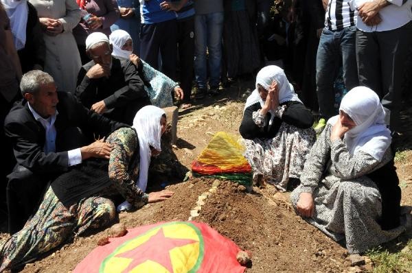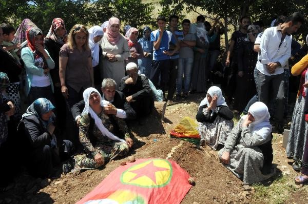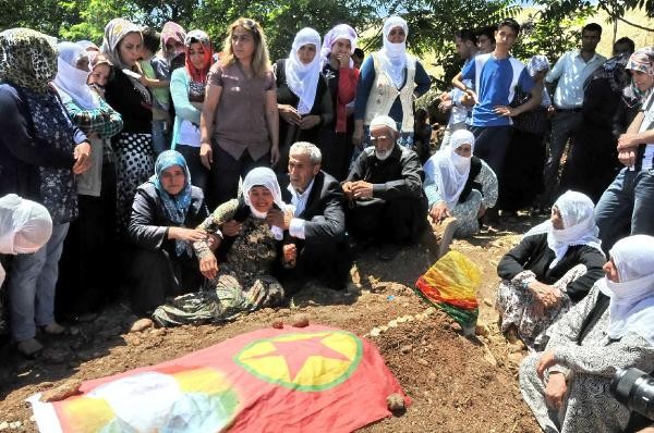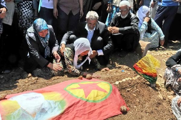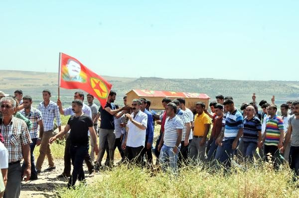 Yeniköy Mezarlığı'nda bu sabah saatlerinde dini vecibeleri yerine getirildikten sonra cenazesi Dörtyüz Evler Mahallesi'ndeki mezarlığa getirilen Ramazan Yıldız'ın, PKK flaması ile Abdullah Öcalan'ın posterinin sarılı olduğu tabutunu 'Kahrolsun katiller', 'Yaşasın HDP', 'Şehitler ölmez', 'Kürdistan faşizme mezar olacak', 'Yaşasın başkan Apo' sloganları atan grup taşıdı.