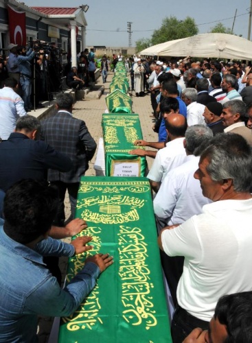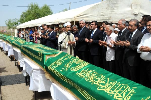 DİYARBAKIR'ın Dürümlü Mezrası'nda PKK'lıların patlayıcı yüklü kamyonu infilak ettirdiği saldırıda kayıp olduğu belirtilen ve DNA testleriyle patlamada öldükleri belirlenen 13 kişi bugün köyde toplu cenaze töreni düzenlendi.