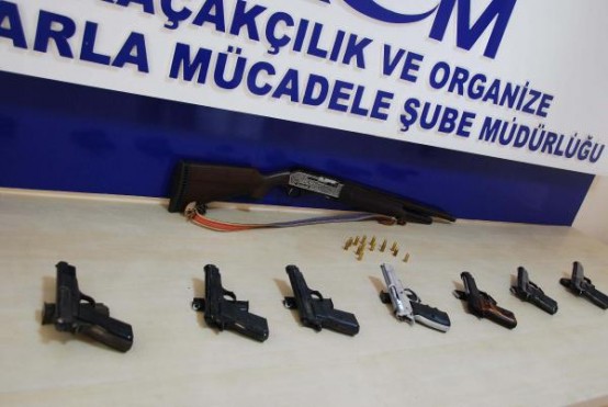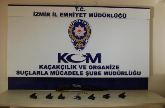 Rize’den, ünlü markaların taklitlerini yaptıkları el yapımı tabancalar ile tüfeği, minibüsün kapısında, 'zula' denilen gizli bölmede saklayıp getirdikleri İzmir’de satmak istedikleri ileri sürülen 3 kişi, polisin operasyonuyla yakalanıp adliyeye sevk edildi.