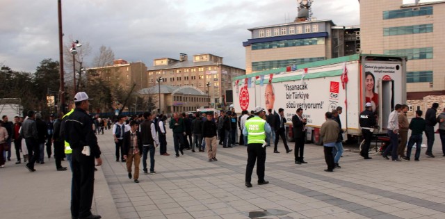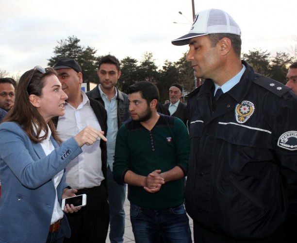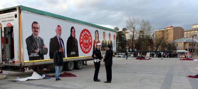ERZURUM'da Havuzbaşı semtindeki Kent Meydanına TIR dorsesinde seçim standı açmak isteyen CHP'li milletvekili adayı Gonca Aytaş ile zabıta ve polisler tartıştı.