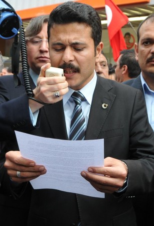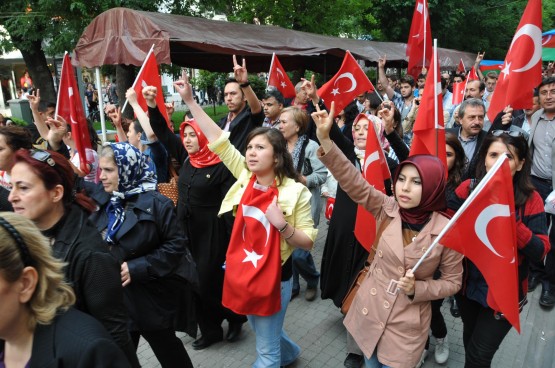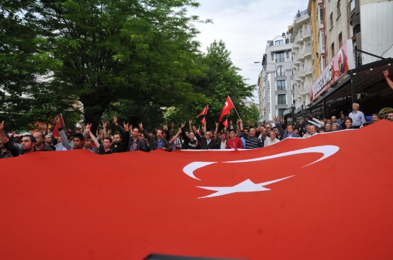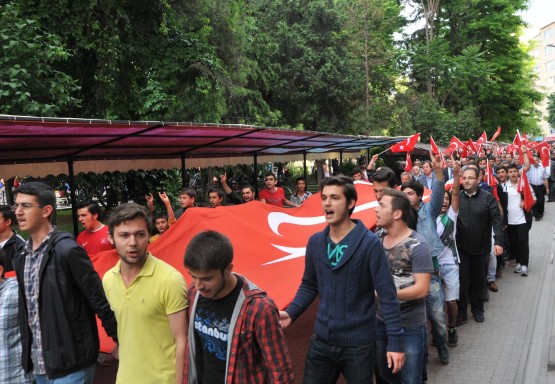 Hamamyolu Caddesi'nden Porsuk Bulvarı'na kadar yürüyen kalabalık sık sık 'Bayrağa uzanan eller kırılsın', 'Türkiye uyuma bayrağına sahip çık', 'Bozkurtlar burada çakallar nerede', 'Alparslan Türkeş'in askerleriyiz', 'Ne mutlu Türk'üm diye', 'Şehitler ölmez, vatan bölünmez', 'Milliyetçi Türkiye' ve 'Tencere çalma bayrağına sahip çık' şeklinde sloganlar attı.