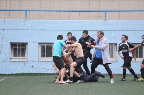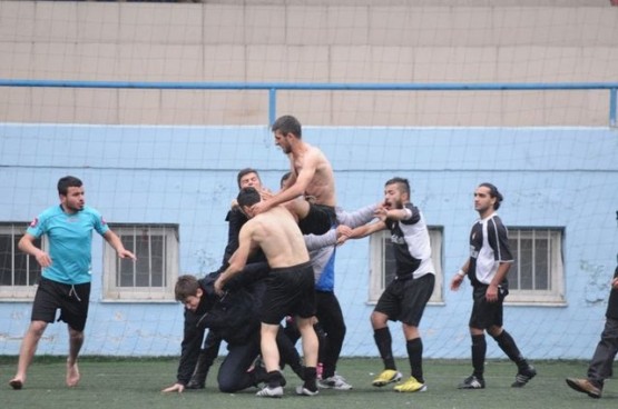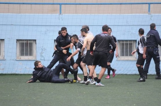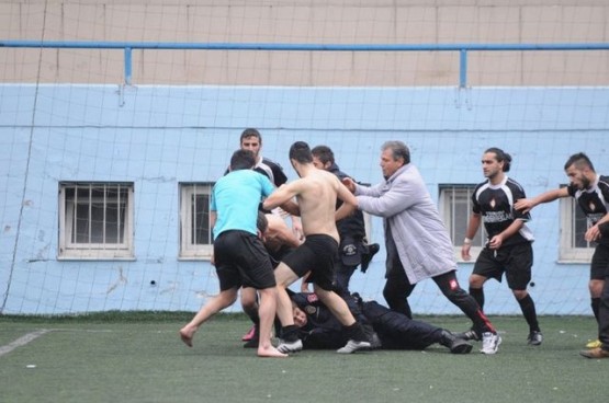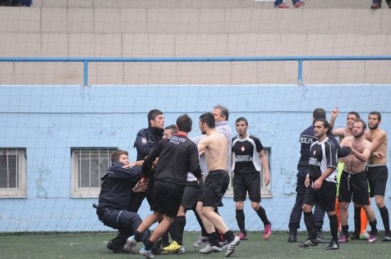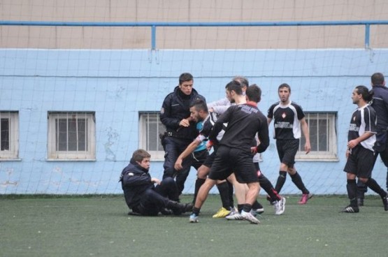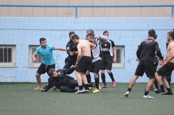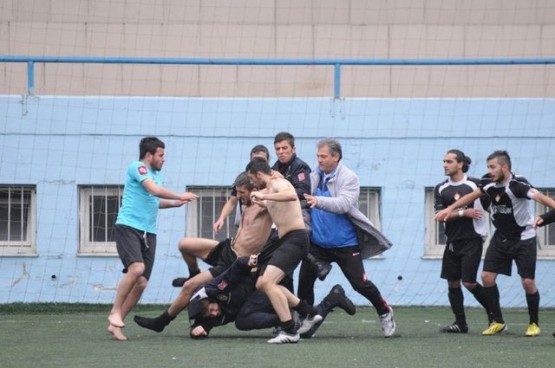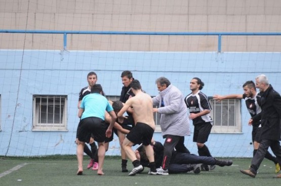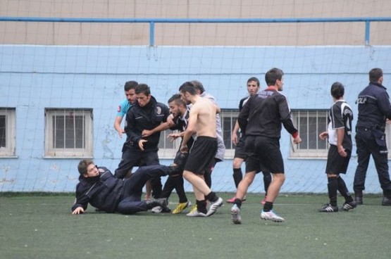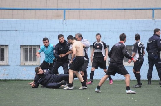 Çıkan arbedede yere düşen polisi bazı futbolcular yerden kaldırmaya çalışırken, bir başka futbolcu ise polise uçan tekme attı.