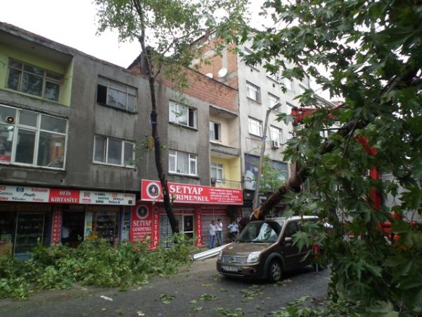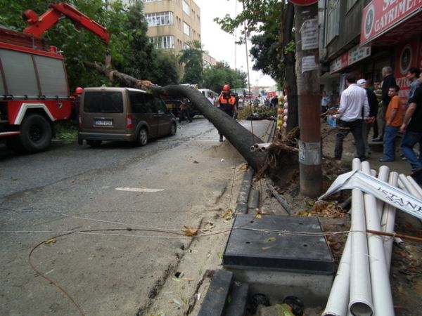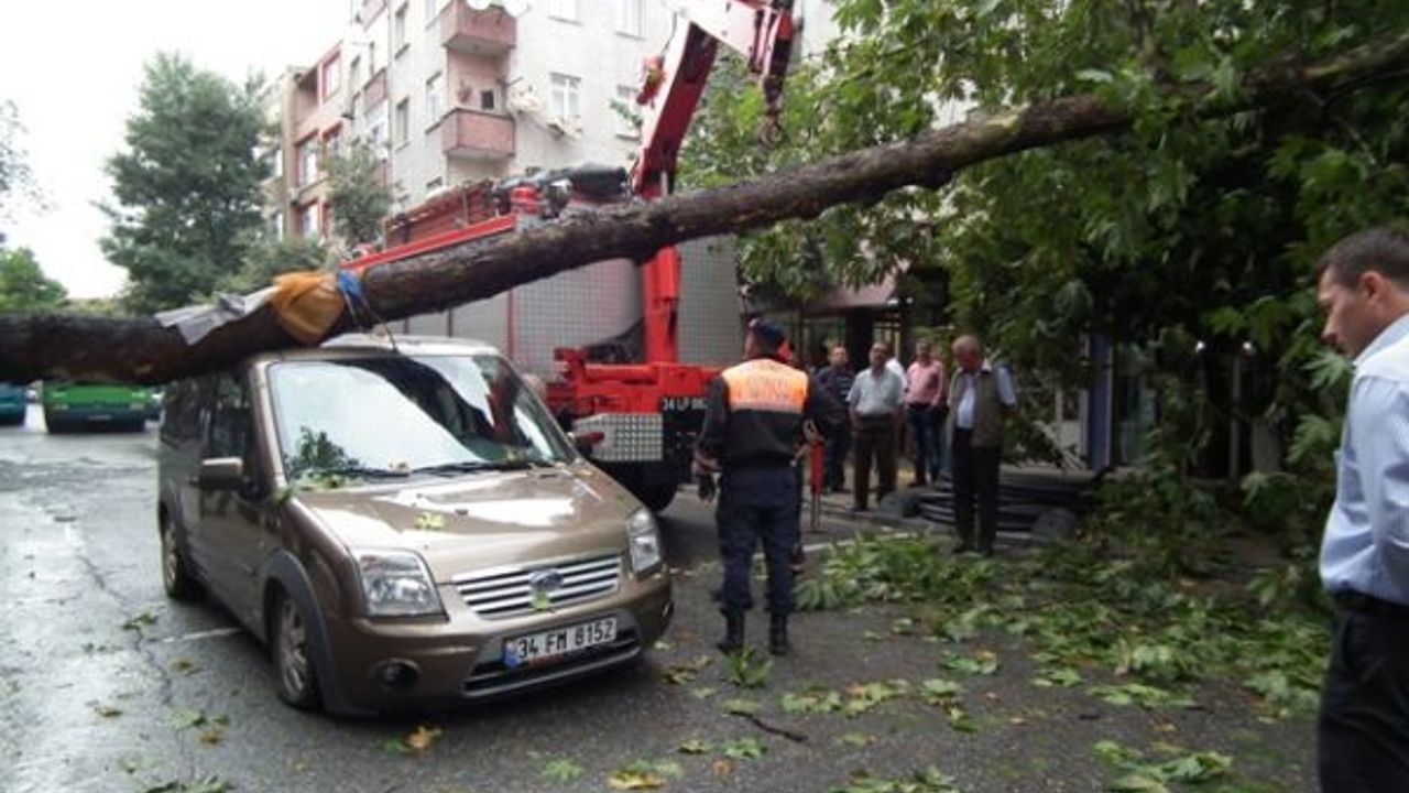 Gaziosmanpaşa'da kaldırım çalışmaları sırasında etrafı açılan ağaç, yağmur ve rüzgarın da etkisiyle yoldan geçen aracın üzerine devrildi.