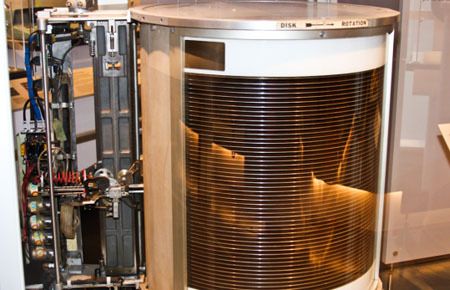 İşte karşınızda dünyanın ilk disk sürücüsü RAMAC. 1956 yılında ilk kez kullanılmaya başlanan bu sürücüde 50 adet 24 inçlik disk yer alıyordu. 1200 RPM'lik dönme hızına sahip cihaz 5 milyon karakterlik veriyi saklayabiliyordu.