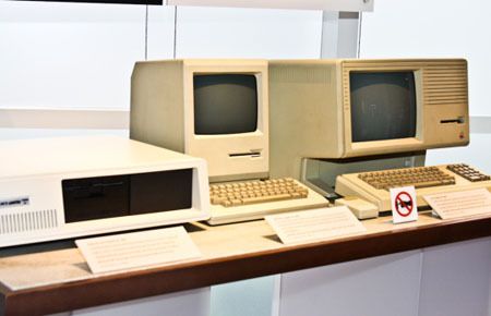 1984 yılının başyapıtları. Soldan sağa sırasıyla IBM PC, Apple Mac ve Apple Lisa. Bu cihazlar kişisel bilgisayar kullanımının artmasına büyük bir katkı yaptılar.