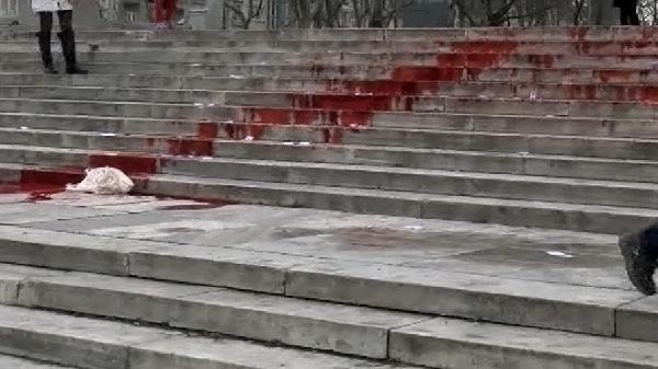 MERDİVENLERE kırmızı boya döken grup, yaka paça gözaltına alındı.