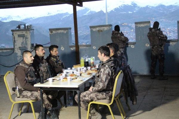 İftar saatinde okunan ezanla sofrada bir araya gelen polisler, dua edip, orucunu açarken, arkadaşları da nöbeti devralıyor. Kentin çevresindeki hakim tepelerde oluşturulan üs bölgelerinde görev yapan özel harekat polisleri, olası terör saldırılarına karşı termal kameralarla her türlü hareketliliği de yakından takip ediyor.