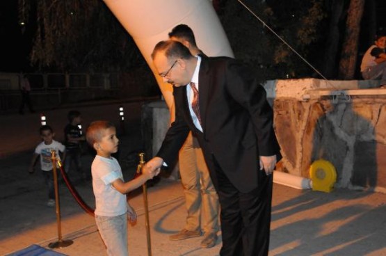 Vali Canbolat, masaları tek tek dolaşıp resepsiyona katılanlarla bol bol sohbet etti. Günün anısına hazırlanan pastayı çocuklarla birlikte kesen Vali Canbolat, daha sonra konuşma yaptı.
