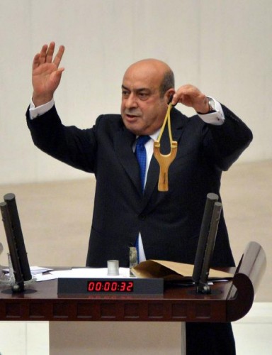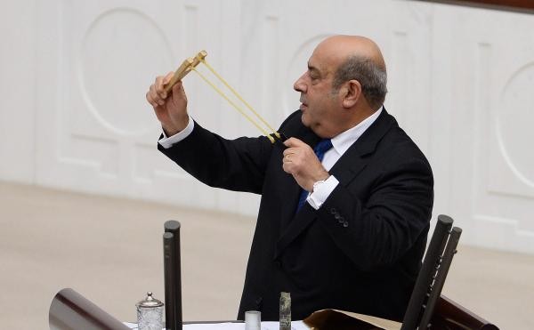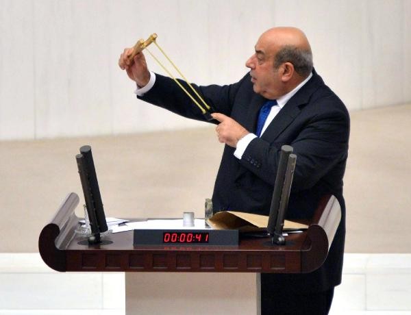 TBMM Genel Kurulu’nda elinde sapanla çıkan ve güvenlik paketini eleştiren HDP Şırnak Milletvekili Hasip Kaplan, Başbakan Yardımcıları Yalçın Akdoğan, Numan Kurtulmuş ve Ali Babacan'a sapanı göstererek, "Sapanın cezası 4 sene, tabancanın cezası 1 sene. Sizin hükümet kuş mudur korkuyor" dedi.
