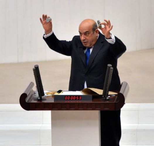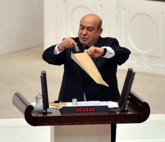 TBMM Genel Kurulu’nda bükçe görüşmelerinin ikinci turunda söz alan HDP Şırnak Milletvekili Hasip Kaplan, sarı bir zarf ile kürsüye geldi. Konuşmasının sonunda zarfın içinden Kpalan, gaz kapsülü ve sapan çıkarttı. Kapsülleri gösteren Kaplan, ardından eline sapanı alarak komisyon sırasında oturan Başbakan Yardımcıları Yalçın Akdoğan, Numan Kurtulmuş ve Ali Babacan’a sapanı göstererek, “Güvenlik paketi mermi cezası yok. Gaz kapsülü kafada patlasa cezası yok. Bende bir sapan göstereceğim. Sapan 4 sene, tabancanın cezası 1 sene, sizin hükümet kuş mudur korkuyor sayın Akdoğan. Kuş mudur hükümetiniz. Güvenlik hukukla, İnsan hakları, demokrasi, adalet ile korunur. Adaletin olduğu yerde barış olur" dedi.