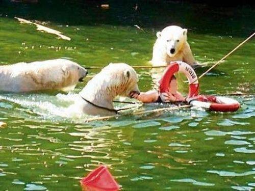 Sudaki boz ayılar bir anda suya düşen kadının yanına giderken kadının çığlığını duyan çevredekiler can simitleri atarak hayvanları uzaklaştırmaya çalışırken diğer yandan sarkıttıkları halatla kadını çekmeye çalıştı.