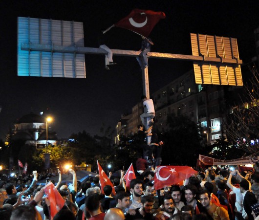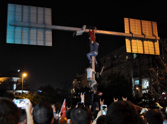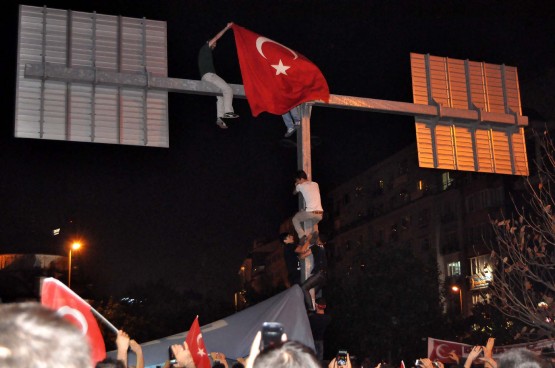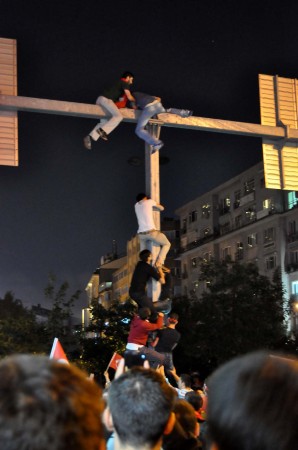 Ülkü Ocakları İl Başkanı Ahmet Yiğit Yıldırım konuşmasını sürdürdüğü sırada, kalabalık grup içerisinden sıyrılan bazı kişiler, Şişli Camii önünde bulunan trafik yön levhalarını gösteren direğe tırmandı. Birbirlerinin üzerlerine çıkarak direğin üstüne ulaşan gruptan bir kişi, burada Türk bayrağı açtı.