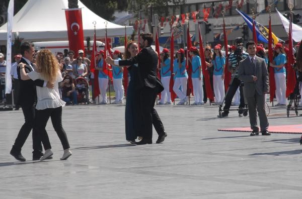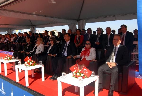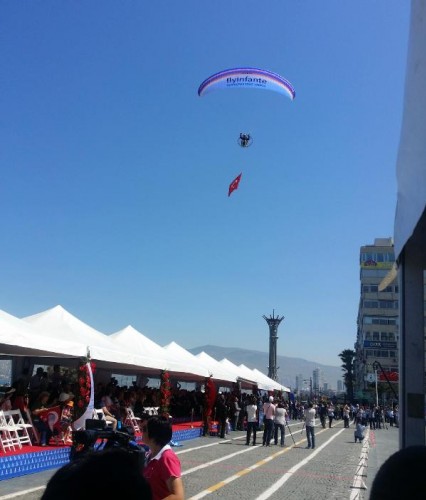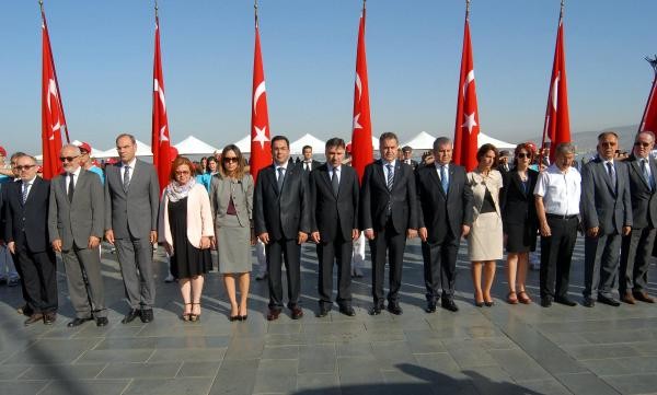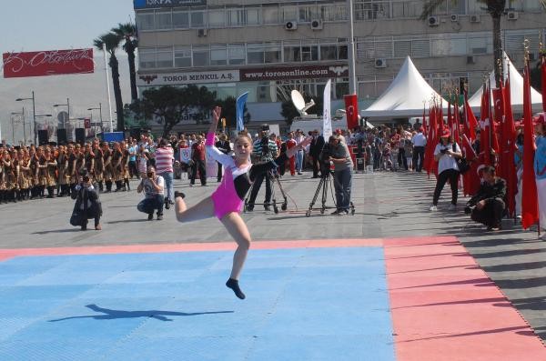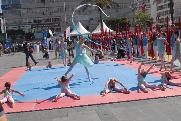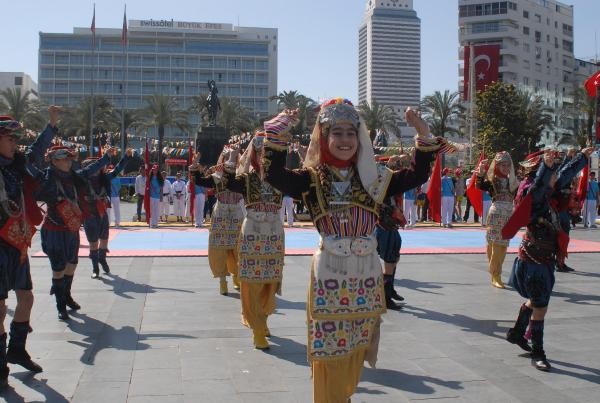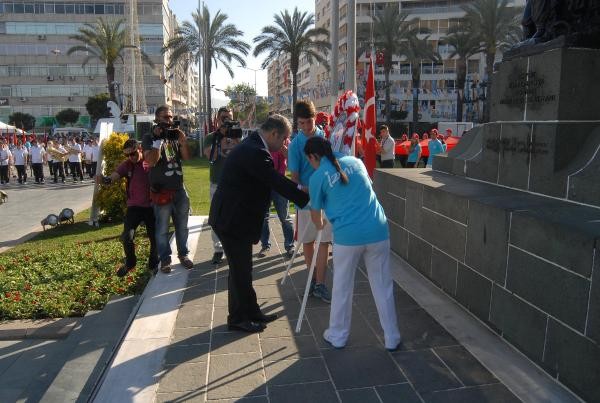 Açılış konuşmasının ardından, Karşıyaka'da Atatürk'ün Annesi Zübeyde Hanım'ın annesinin mezarından alınan toprak 'Anadan Ataya bisiklet turu' etkinliğiyle Türk bayrağıyla birlikte Vali Mustafa Toprak'a teslim edildi. Sonrasında ise Namık Kemal Lisesi öğrencileri Eda Dalgın ile Çağdaş Çilek, şiir okudu. Bornova Halk Oyunları Gençlik ve Spor Derneği üyeleri zeybek oynadı, Bayraklı Halk Eğitim Merkezi ekibi Kafkaf gösterisi yaptı. Törenin gösteriler bölümünde, öğrencilerin ve sporcuların gösterileri nefes kesti. Gençlik Hizmetleri ve Spor İl Müdürlüğü sporcuları, ritmik jimnastik, karate, sportif aerobik, Wushu, kick-boks, muay thai gibi dövüş sporlarından örnek gösterilere yaptı. Gençlerin gösterisi, step, aletli cimnastik ve Roman Ateşi ile Balkan halk dansları topluluğunun müzikli dans sunumuyla son buldu. Törenin sonunda, bayraklı paramotor uçuşu yapıldı.